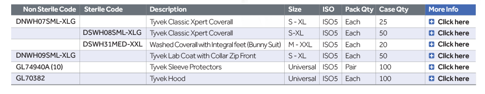 | DNWH07SML-XLG | | Tyvek Classic Xpert Coverall | S-XL | ISO5 | Each | 25 |