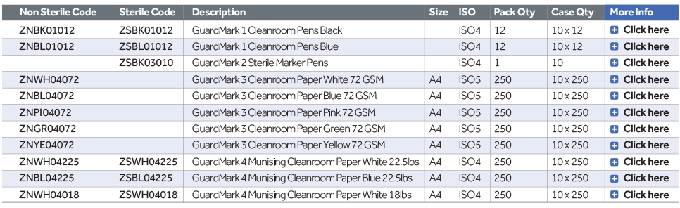 | ZNBL04072 | | GuardMark 3 Cleanroom Paper Blue 72 GSM | A4 | ISO5 | 250 | 10x250 |